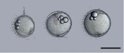 | メダカの野生集団は、生息域で遺伝的に大きく異なっています。例えば、新潟産のメダカから系統化したHNIはとても小さい卵を産みます(左卵)が、東韓国のメダカから系統化したSOKは大きな卵を産みます(右卵)。HNIとSOKの交雑個体はその中間の大きさの卵を産みます(中卵)。さらに遺伝学的解析を行うことでメダカの卵サイズは比較的少数の遺伝子が決めていることが判りました。 現在その遺伝子の同定を行っています。自然集団にある多様性を支える遺伝 子を探ることができるのはメダカの大きな利点です。 |