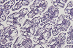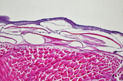 メダカは基本的に丈夫な魚種ですが、当然、病気になることもあります。研究室では、 密度を高くして飼育するので、寄生虫の発生も決してめずらしくありません。健康メダカ計画と 連動して、メダカの病理学を確立するべく、病気になったり、体調が悪くなったりしたメダカの 組織切片を作成し、組織像を観察して知見を蓄積中です。